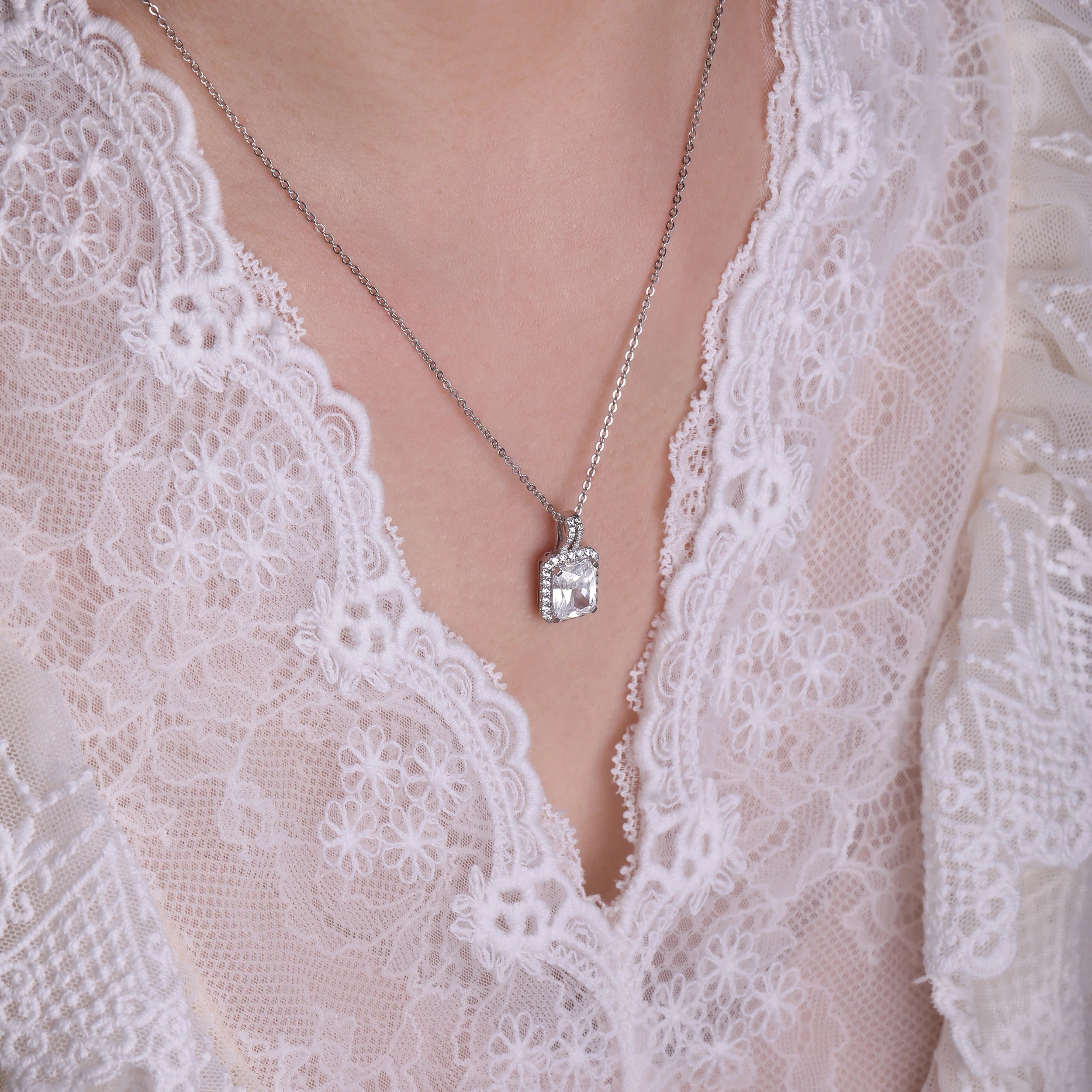 Crafted for the modern woman who values elegance and sustainability, this radiant diamond pendant is a symbol of timeless sophistication. Featuring an radiant-cut lab-grown diamond, framed by a halo of brilliant-cut diamonds, the pendant’s diamond-encrusted bail enhances its overall brilliance. This emerald cut diamond pendant offers the perfect blend of classic design and modern luxury.