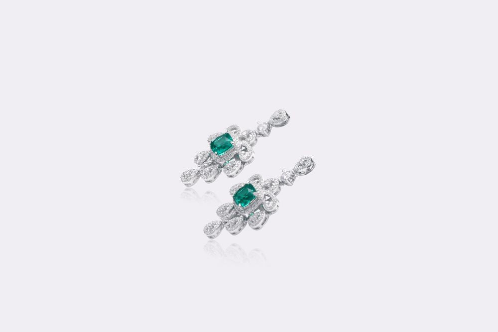 The Emerald Cascade Lab-Created Diamond Chandelier Earrings are a stunning representation of opulent elegance. These exquisite earrings feature a breathtaking cushion-cut lab-created emerald as the centerpiece, surrounded by an intricate design of lab-created diamonds in various cuts.