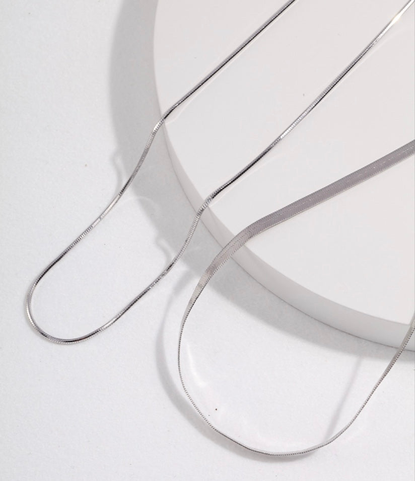 This sterling silver/Gold necklace showcases a sleek, snake chain design that embodies modern elegance. The smooth, reflective surface of the chain adds a touch of sophistication, making it a versatile accessory for any occasion.